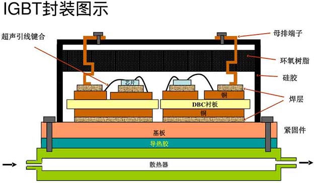IGBT模块是由IGBT(绝缘栅双极型晶体管芯片)与FWD(续流二极管芯片)通过特定的电路桥接封装而成的模块化半导体产品;封装后的IGBT模块直接应用于变频器、UPS不间断电源等设备上;